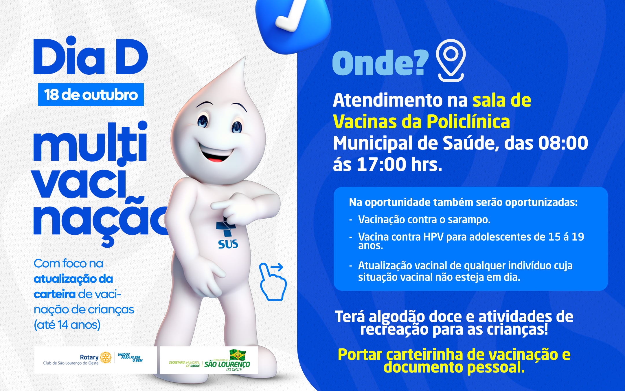 A Secretaria Municipal de Saúde de São Lourenço do Oeste realiza no sábado, dia 18 de outubro de 2025, o Dia D da Campanha de Multivacinação,