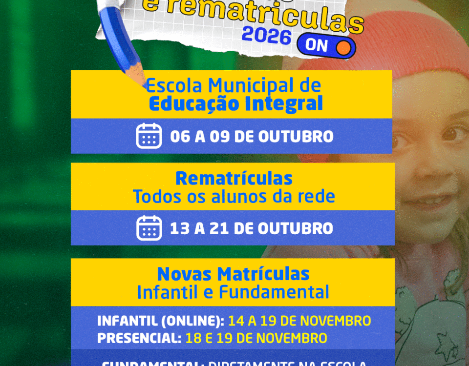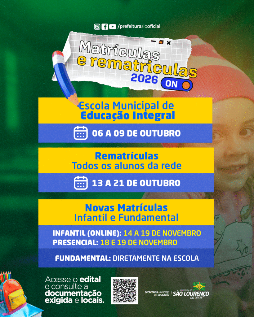 6 de outubro de 2025Período de matrículas e rematrículas da rede municipal começa em outubroA Secretaria Municipal de Educação de São Lourenço do Oeste publicou o Edital nº 01/2025, que define as datas e normas para o processo de rematrículas […]