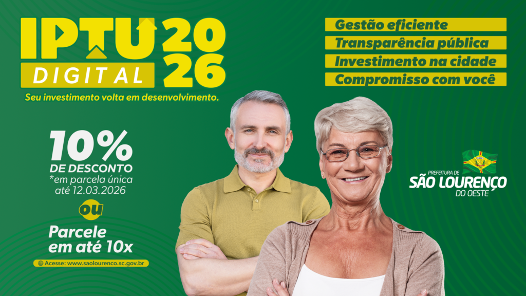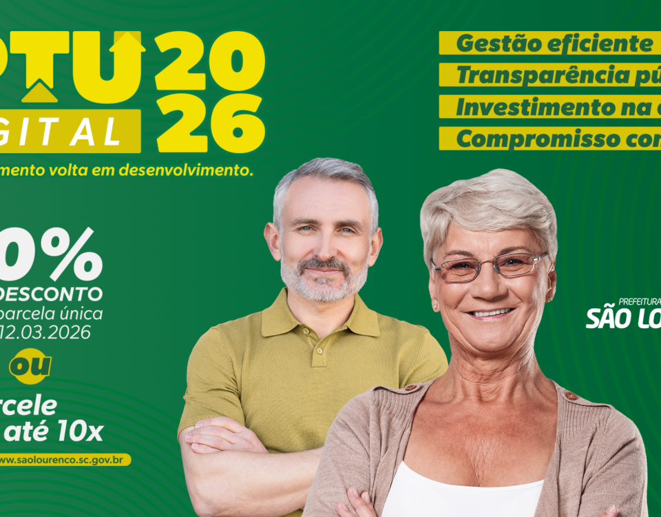 25 de fevereiro de 2026IPTU 2026 já está disponível e é 100% digital em São Lourenço do OesteA Prefeitura de São Lourenço do Oeste informa que o IPTU 2026 (Imposto Predial e Territorial Urbano) já está disponível para emissão das guias de pagamento. […]